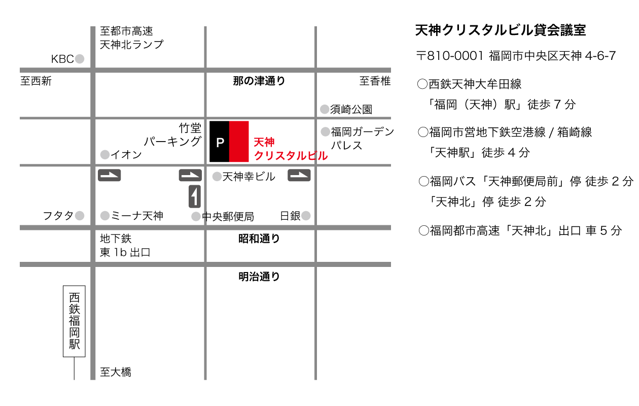 天神クリスタルビル 福岡市中央区天神4丁目6-7 アクセスマップ 周辺地図 天神クリスタルビル貸会議室 MENU トップ アクセスマップ 駐車場マップ レイアウト図 備品使用料 フロアマップ ご利用者の声 会議室申込手順(初めての方へ) 仮予約申込フォーム FAX仮予約申込書 本予約申込書